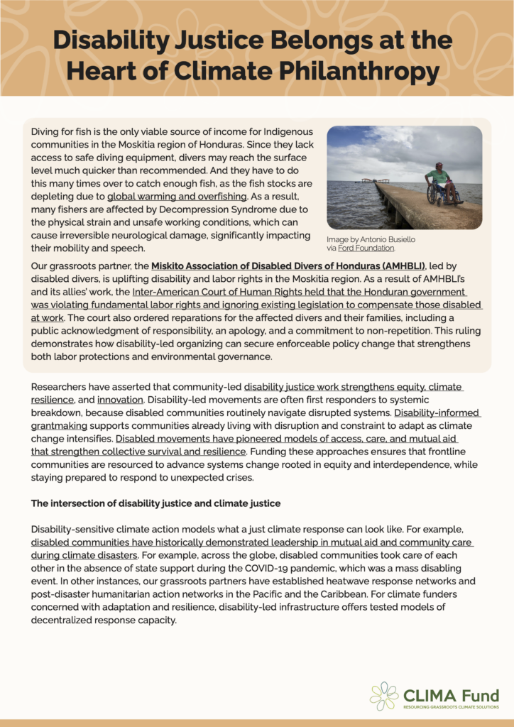 Check out our disability justice brief to learn how funders can resource grassroots-led work at the intersections of climate and disability justice.